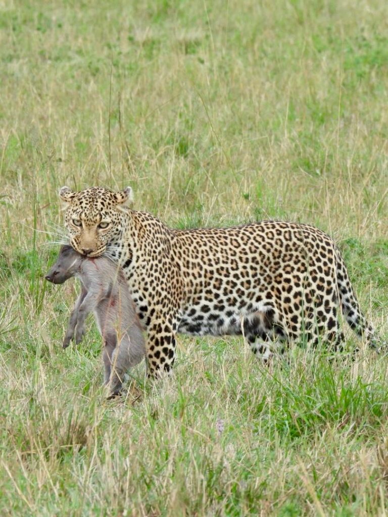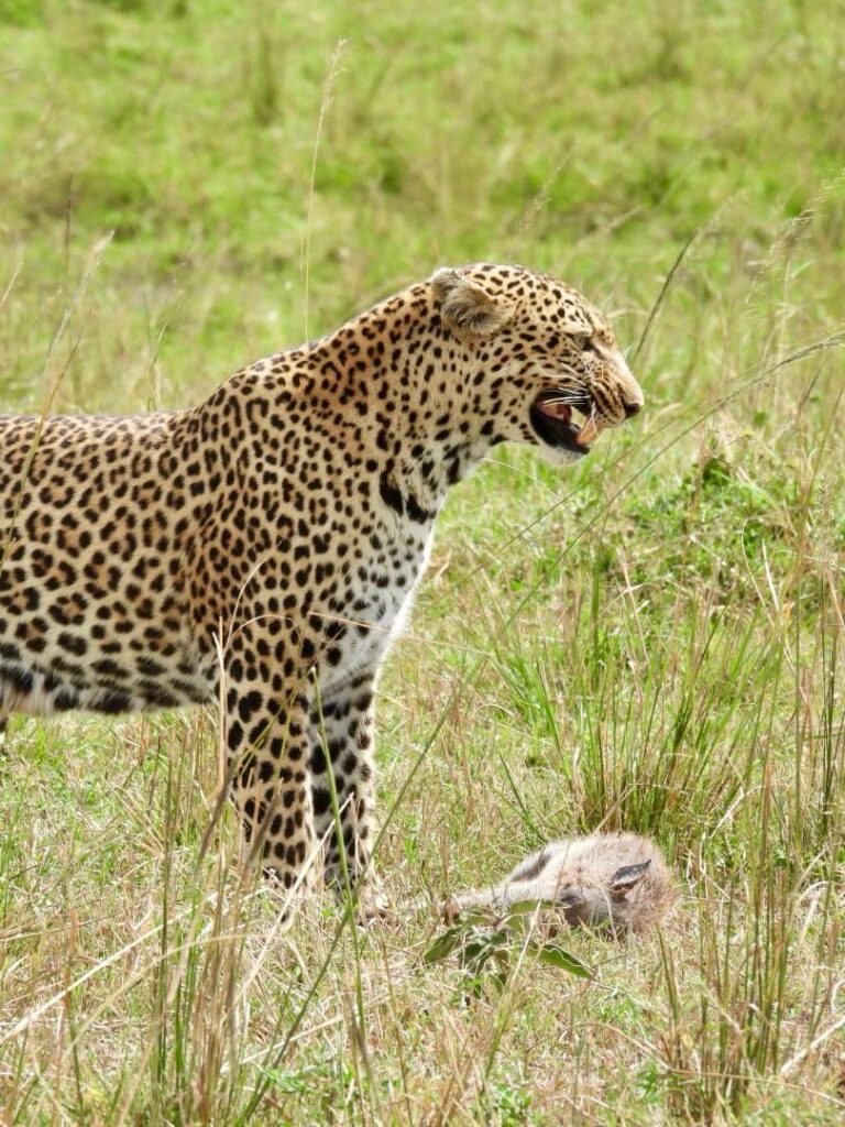 Après une matinée incroyable, nous avons fait une pause déjeuner au milieu du Masai Mara, profitant de la vue sur la savane. Puis nous sommes reparties pour observer les animaux. Nous avons revu certains des habitants de la matinée, mais le clou de l’après-midi a été notre rencontre avec un léopard en pleine chasse.