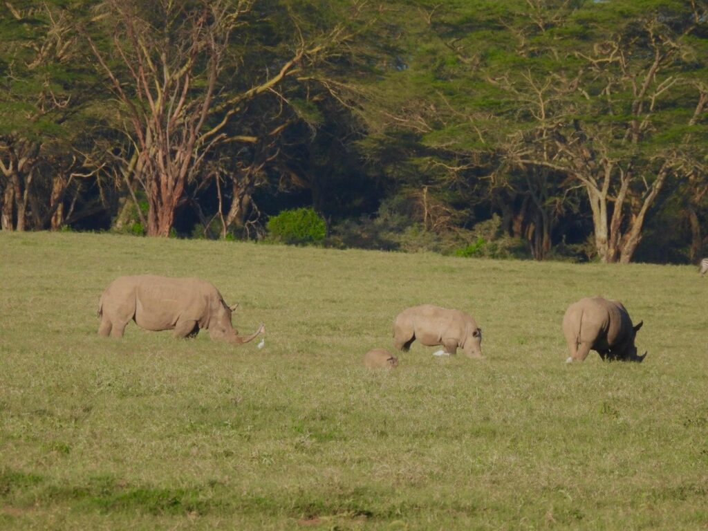 Nous sommes arrivées tardivement dans le parc national de Nakuru, mais c’était pour une raison précise : voir les rhinocéros. En effet, dans les parcs que nous allions parcourir avec notre itinéraire initial, nous n’aurions pas eu la chance de les apercevoir. Ce détour était donc nécessaire pour compléter notre Big Five.