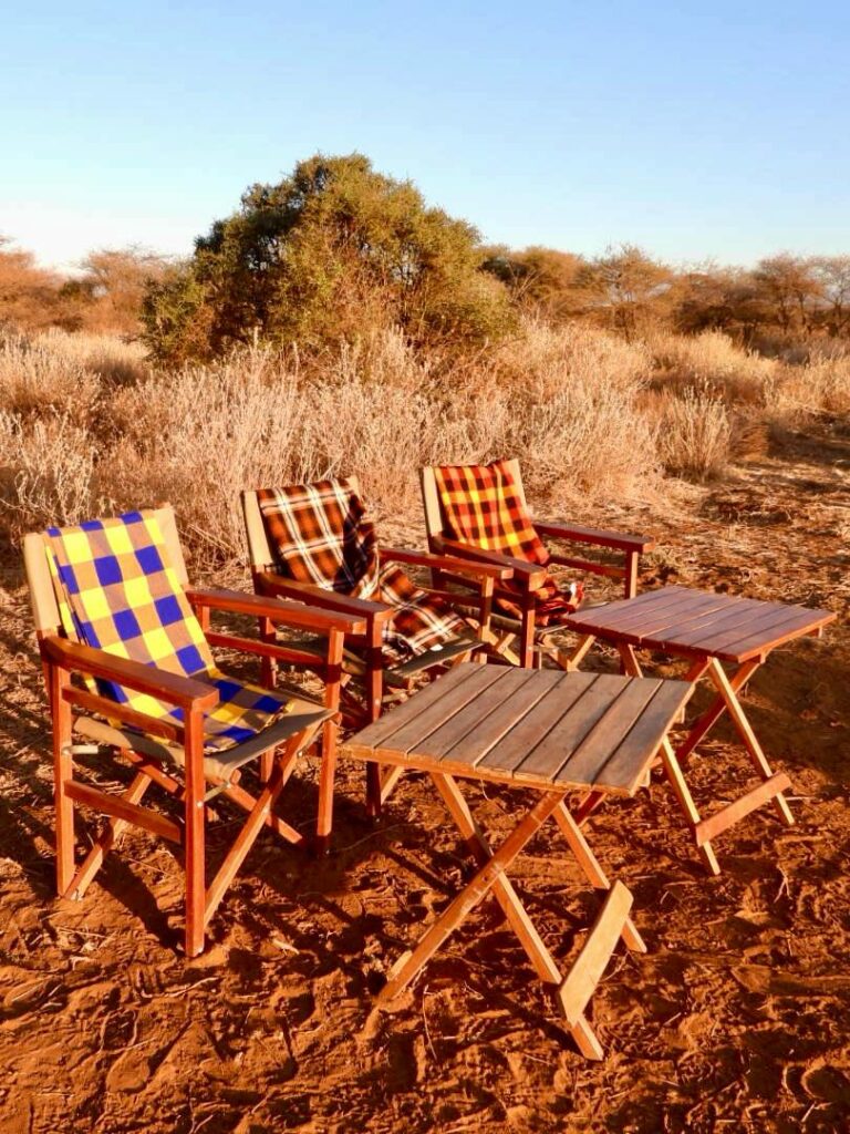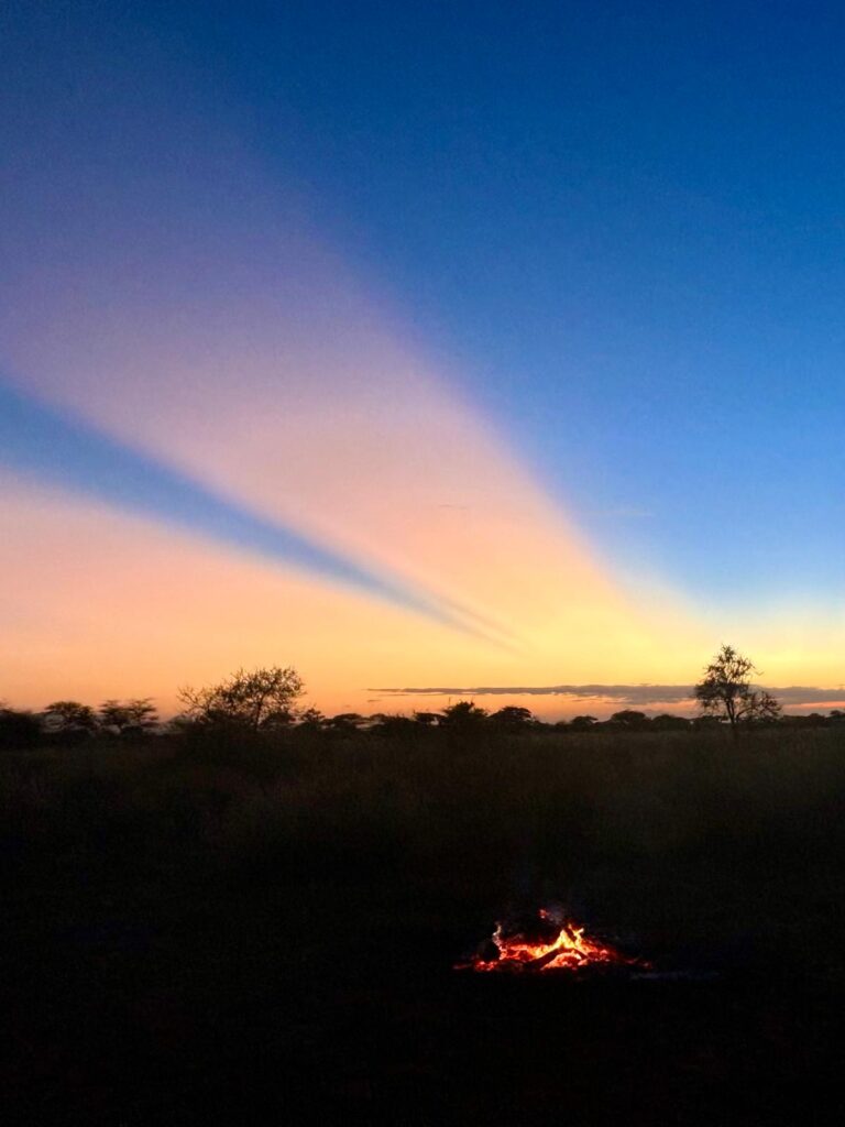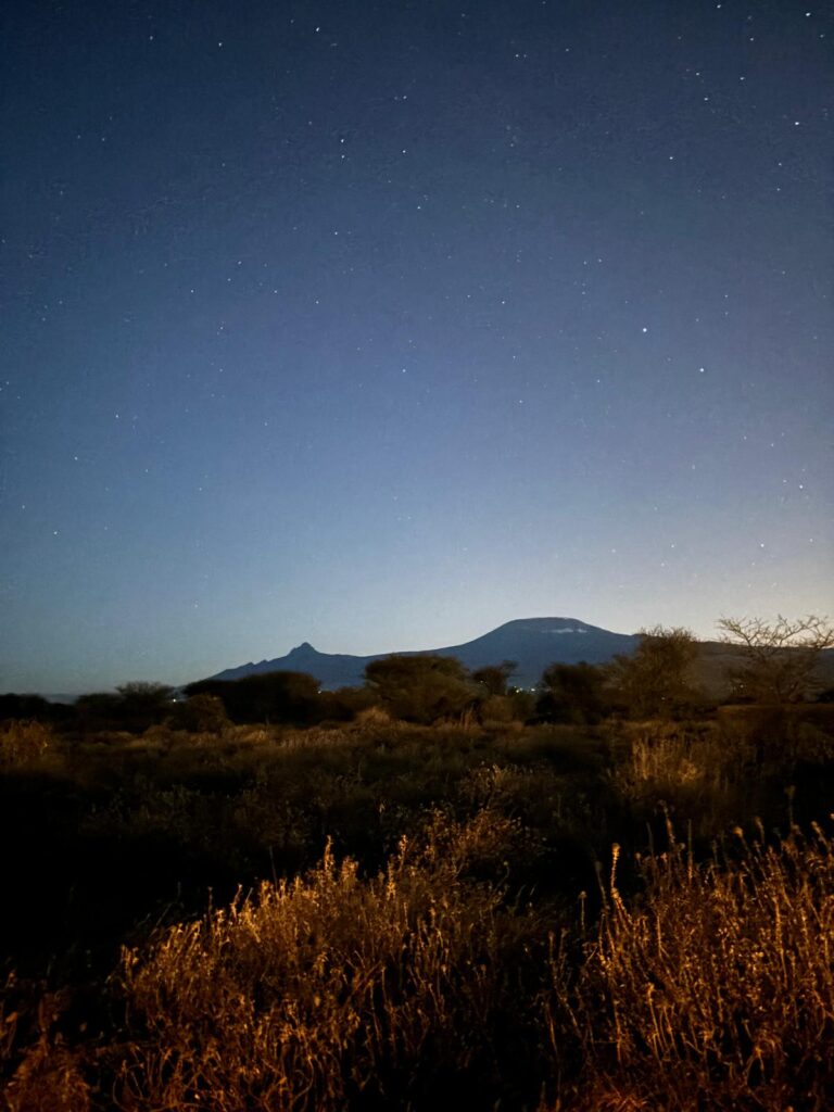 Nous sommes arrivées en fin d’après-midi, et nous n’avons pas fait de safari immédiatement. Nous avons profité de ce moment pour nous reposer un peu et découvrir notre chambre, tout en admirant le cadre incroyable du lodge. En soirée, nous sommes parties pour une excursion dans la brousse avec Jacob, notre guide local. Nous avons eu la chance d’assister à un coucher de soleil magnifique, accompagné d’un petit apéro au milieu de la savane. Et, cerise sur le gâteau, le Kilimandjaro se dévoilait timidement de nuit, ajoutant encore plus de magie à ce moment déjà inoubliable.