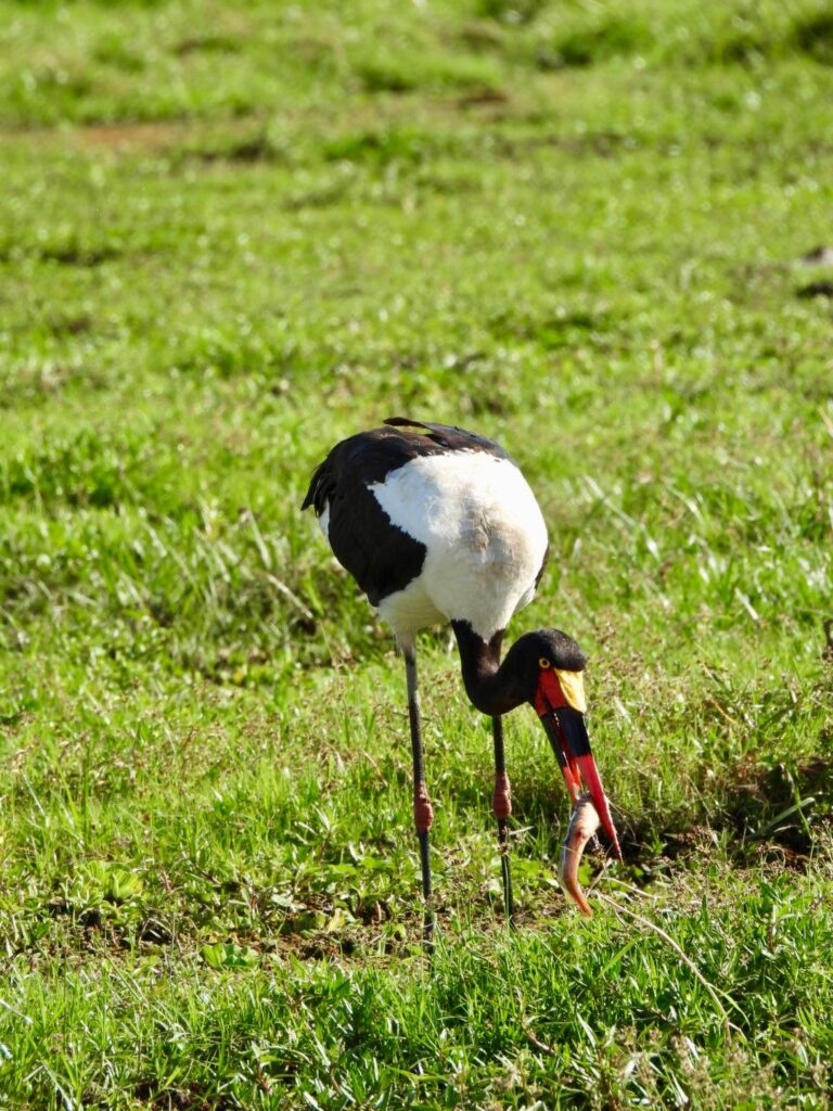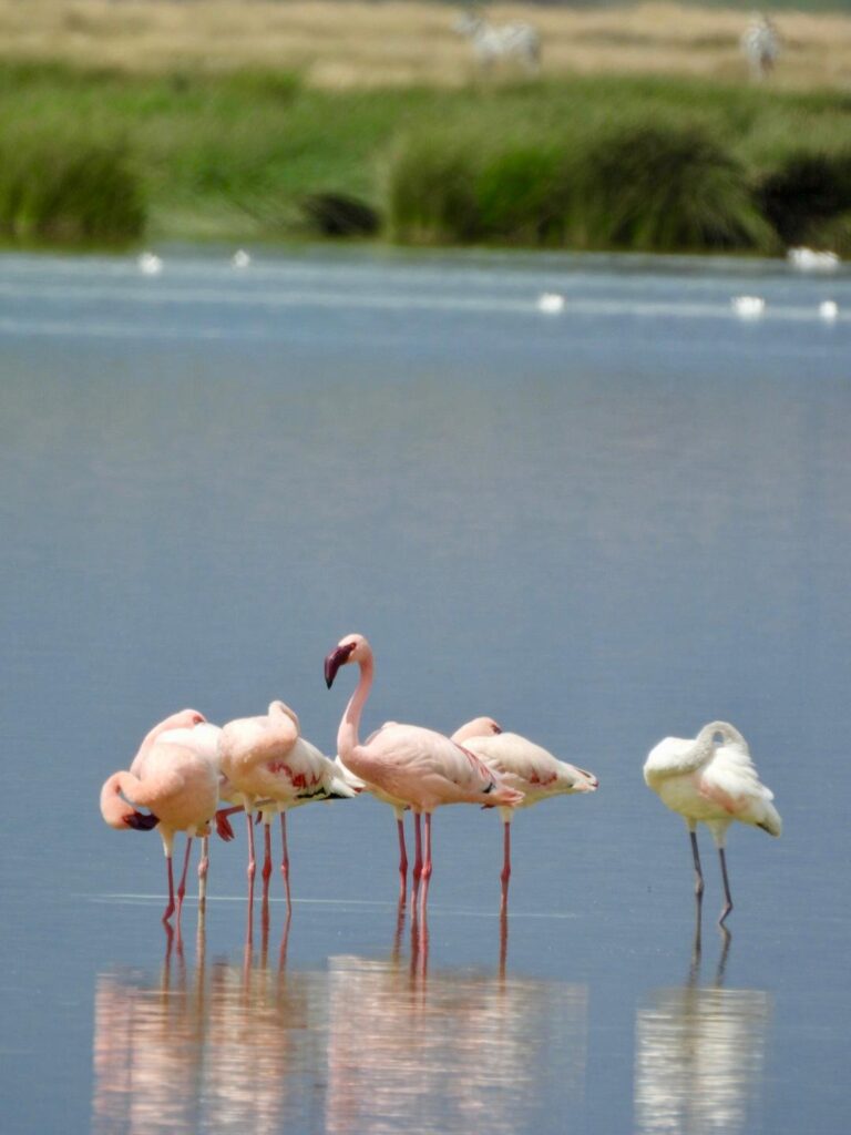 Mais ce n’était pas tout ! Nous avons aussi vu des autruches, des pintades, des zèbres, des gnous et de nombreux oiseaux. Parmi eux, les aigrettes, qui vivent en symbiose avec les buffles, les girafes et les éléphants. Nous avons même aperçu des flamants roses et revu des hippopotames, dont un petit bébé adorable. Et tout cela rien que pendant la première partie de la journée !