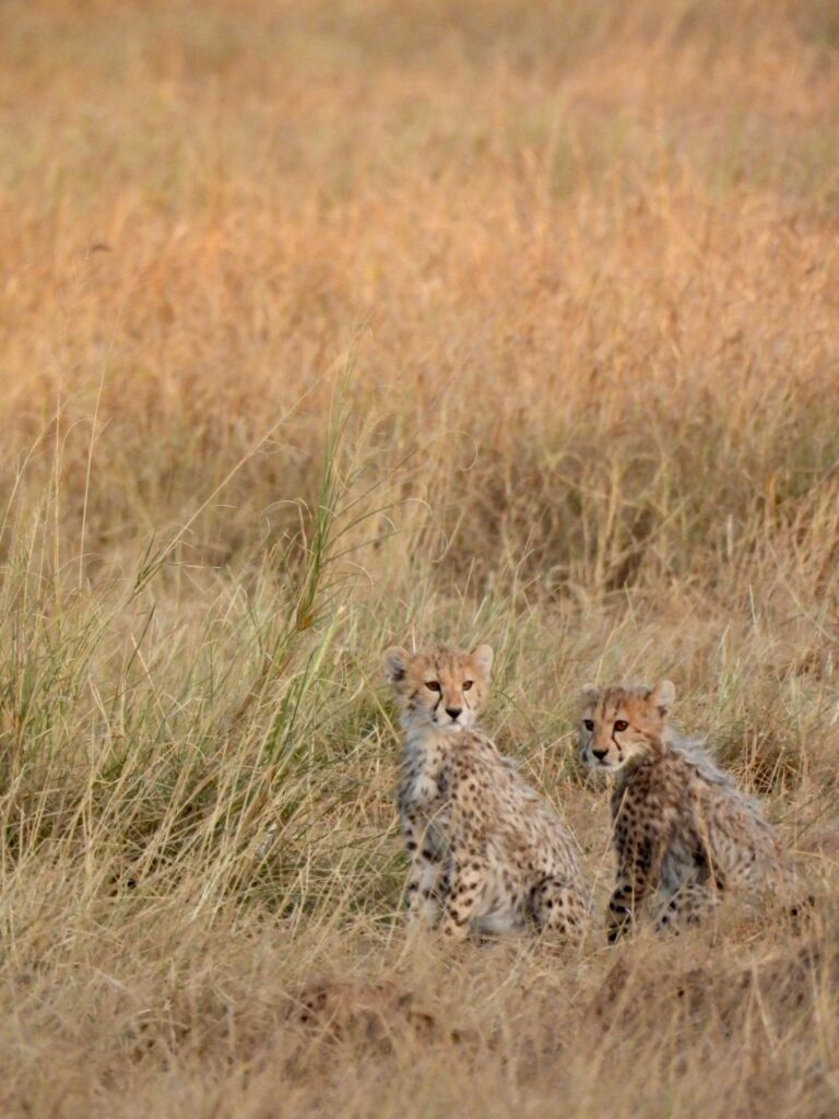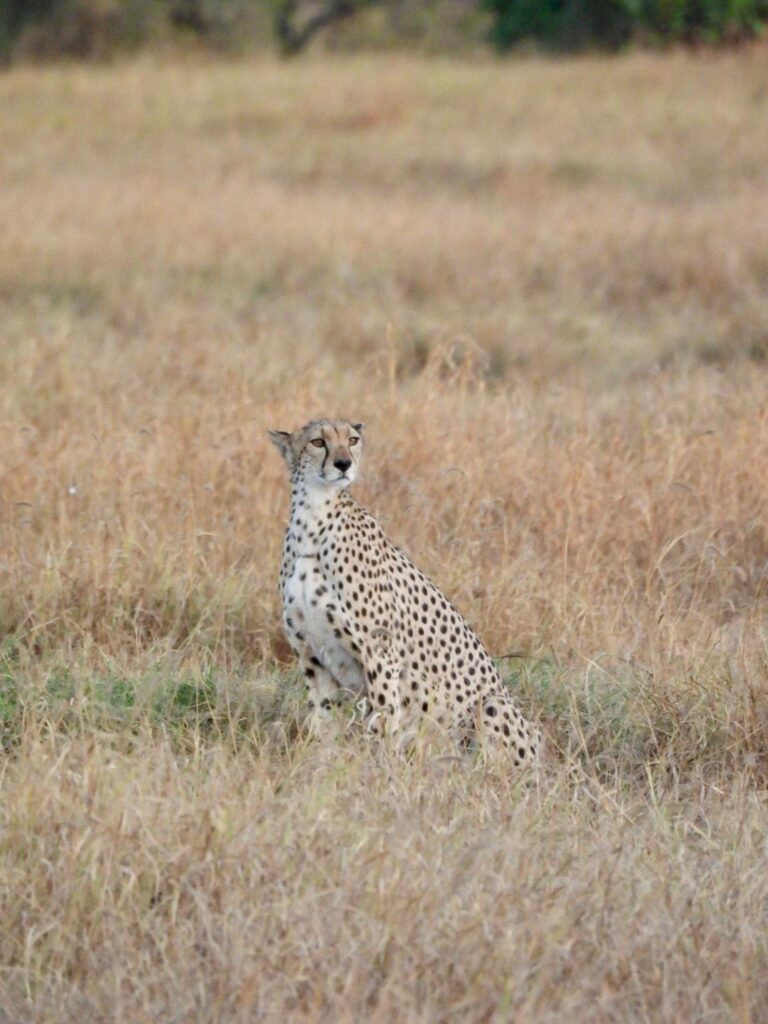 En fin d’après-midi, nous sommes reparties pour le safari. Et là encore, nous avons croisé des éléphants majestueux, un spectacle toujours aussi incroyable. Depuis le matin, nous cherchions absolument les guépards, car le parc d’Amboseli est réputé pour en abriter. Et pourtant, aucune trace… jusqu’au moment où nous avons décidé de rentrer à l’hôtel. Juste à la sortie du parc, nous sommes tombées sur une maman guépard et ses petits. Un moment tout simplement magique et inoubliable !