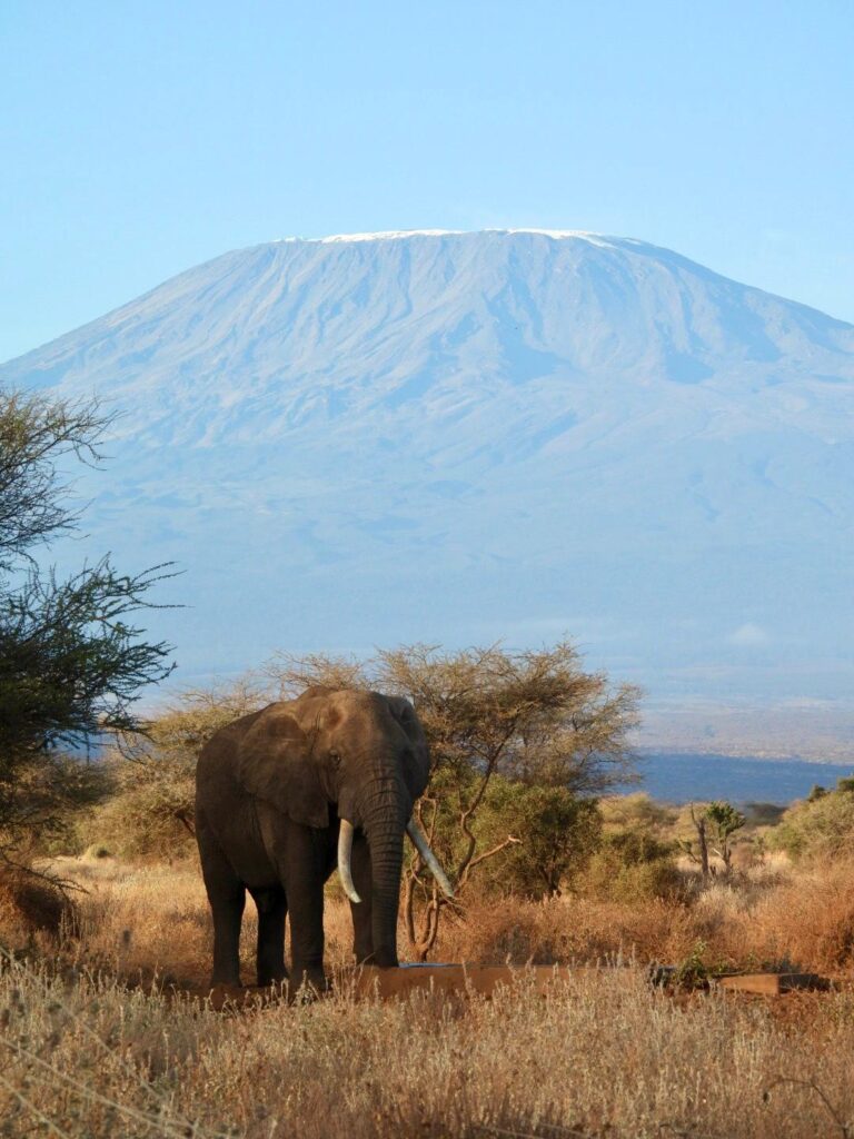 Deuxième matin dans le lodge, et encore une fois, nous avons été émerveillées. En ouvrant la tente, nous avons découvert un éléphant majestueux juste devant le Kilimandjaro, complètement dégagé. Ce moment était tout simplement impensable : se réveiller avec une telle vue était un vrai rêve éveillé. Nous en avons profité pour prendre quelques photos, car peu de temps après, le Kilimandjaro s’est couvert de nuages.