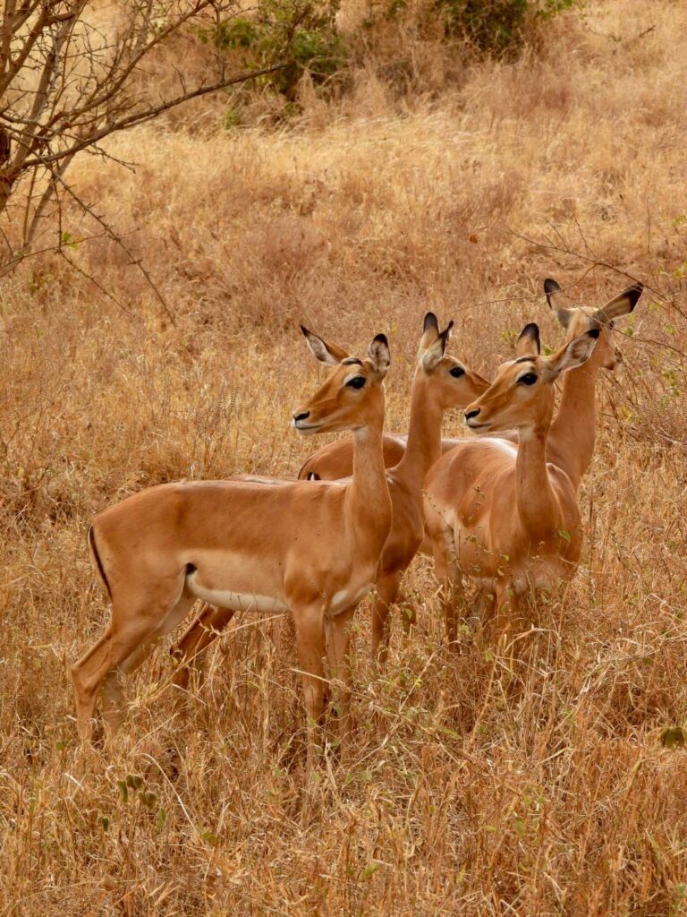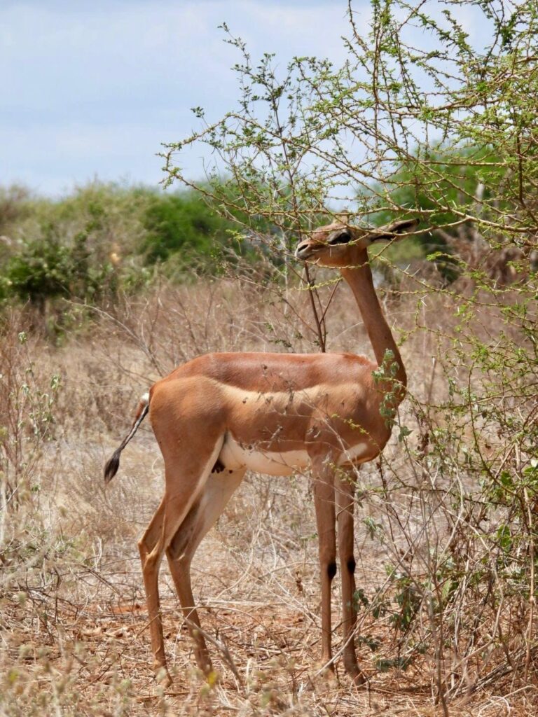 La dernière journée de notre safari a commencé, et nous avons quitté notre lodge pour nous rendre cette fois dans le parc national de Tsavo East. Comme à chaque nouvelle étape, la faune nous a offert un spectacle incroyable. Pendant la matinée, nous avons croisé des girafes, des éléphants, et avons même découvert un gérénuk, une antilope girafe au cou long et gracieux. Chaque rencontre nous rappelait la richesse et la diversité de la faune kenyane.