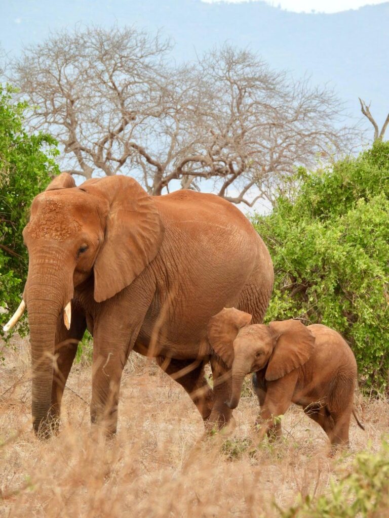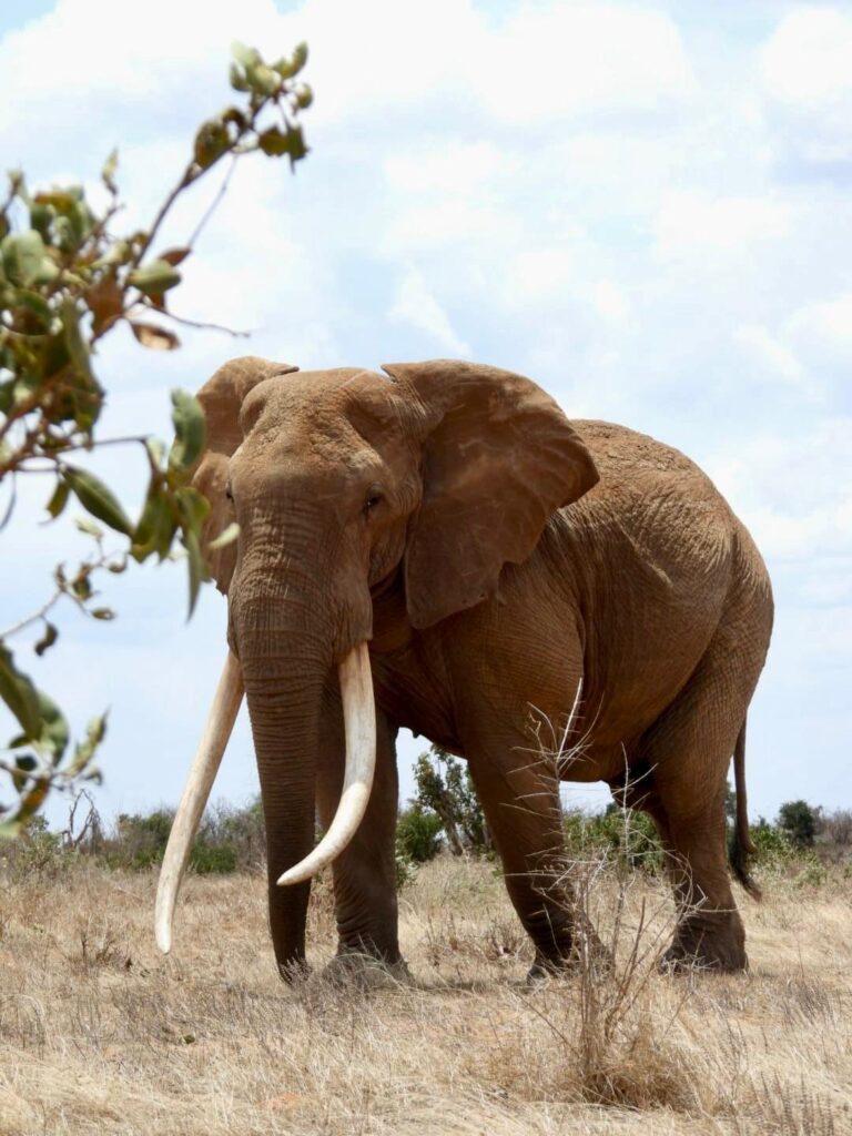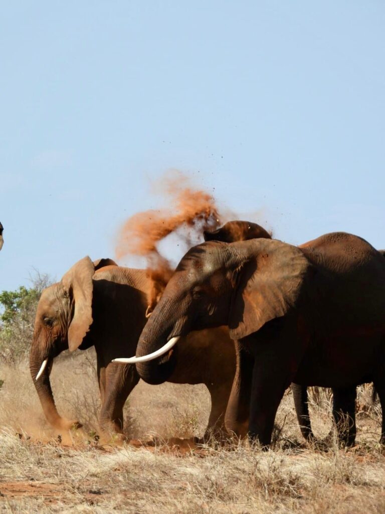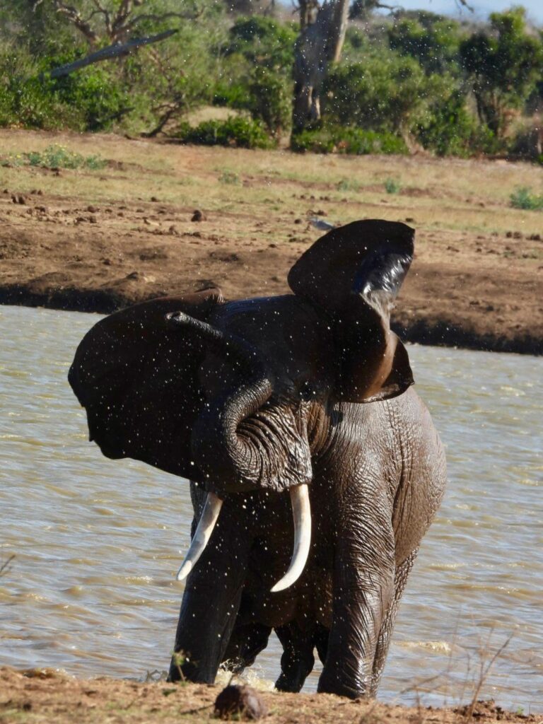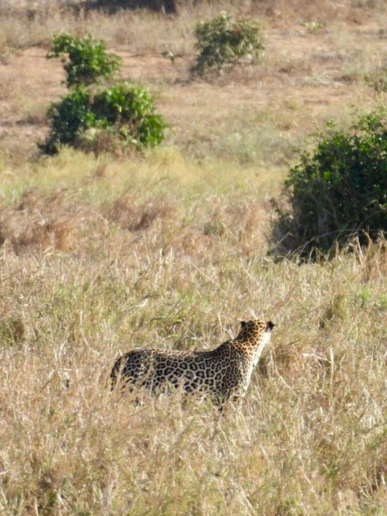 L’après-midi, nous sommes reparties pour prolonger notre dernier safari à Tsavo Est. Nous avons eu la chance de croiser un éléphant patriarche, un “big tusker” qui s’était isolé de son troupeau, comme le font certains mâles âgés pour passer leurs derniers moments seuls. Plus loin, nous avons observé des éléphants jouant avec le sable et l’eau, se rafraîchissant en se jetant de la terre sur le corps. Nous avons même eu la chance de revoir un léopard se promener dans les hautes herbes.